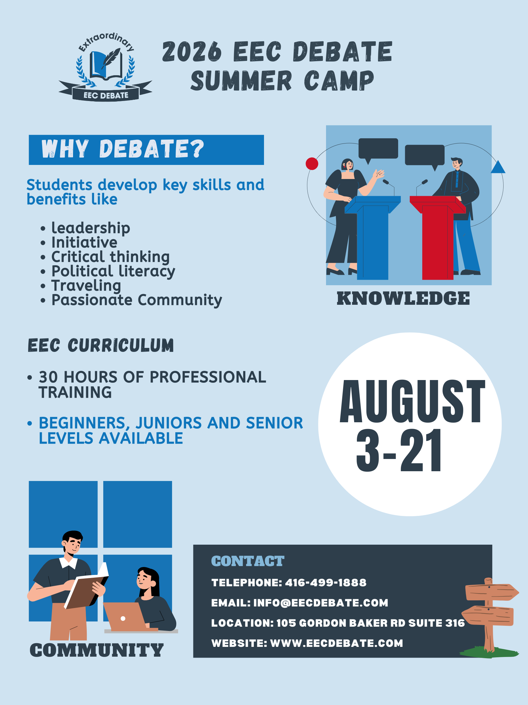 Get ahead of the crowd by honing your skills at EEC Debate’s summer camp! Learn essential debate skills from our experienced coaches, and spar against other dedicated debaters. Sign up below!